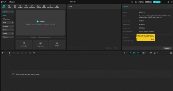 Open CapCut Desktop. To start, on the home screen, you will need to click New Project. This gives you a transparent editing timeline in which you can compile the video material of your influencer.