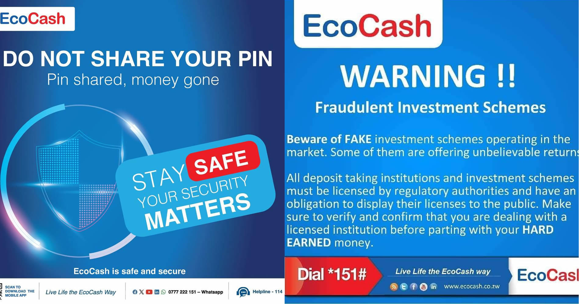 “NEVER share your secret PIN or OTP with anyone. The mobile money service providers, such as EcoCash or OneMoney, will NEVER ask their customers for this information,”